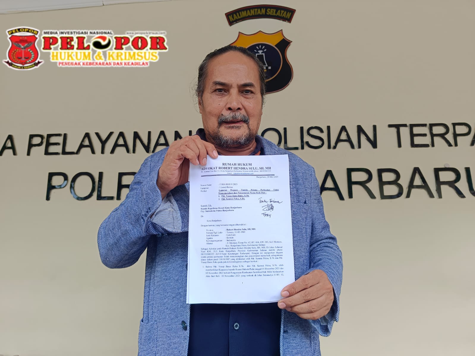 BANJARBARU, peloporkrimsus.com –Sengketa lahan di belakang Gereja GPIB Effatha Guntung Payung, Kota Banjarbaru, Kalimantan Selatan, terus bergulir dan kini berlanjut ke ranah pidana. Berdasarkan keterangan tertulis dari Advokat Robert Hendra Sulu, S.H., M.H., dari Rumah Hukum Robert Hendra Sulu, yang diterima redaksi, dirinya melaporkan dua pendeta, masing-masing Pdt. Samrut Peloa, S.Th., dan Pdt. Yosep Bates Raku, S.Th., ke Kepolisian Resor Kota Banjarbaru atas dugaan perbuatan tidak menyenangkan dan pencemaran nama baik sebagaimana diatur dalam Pasal 310 KUHP.