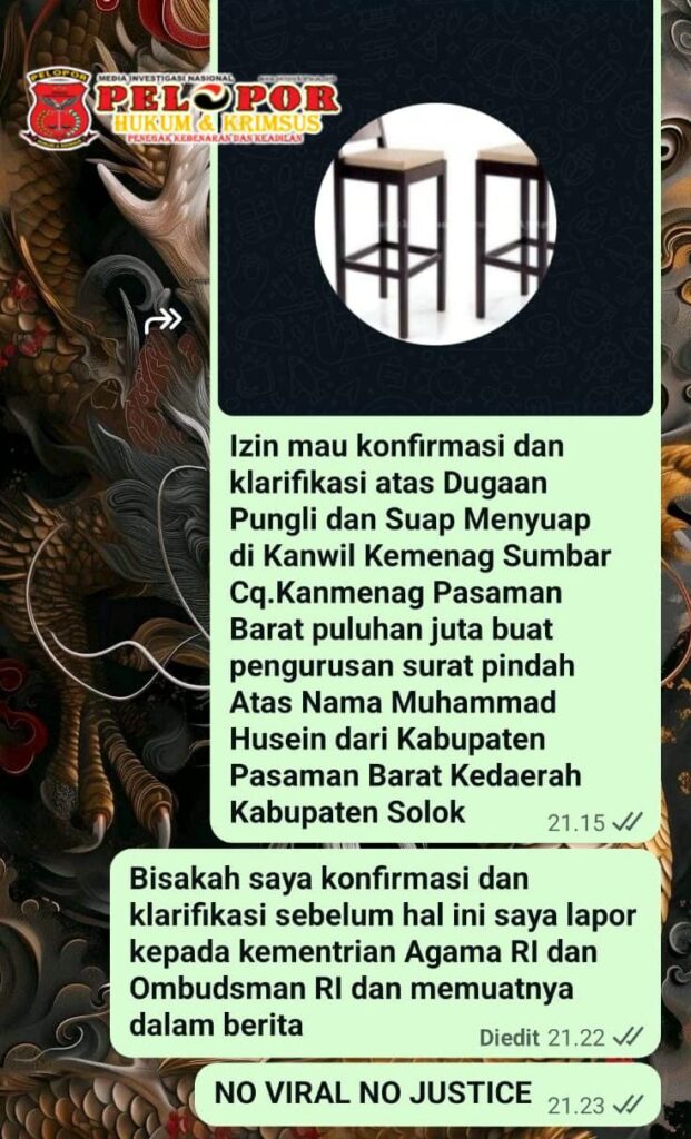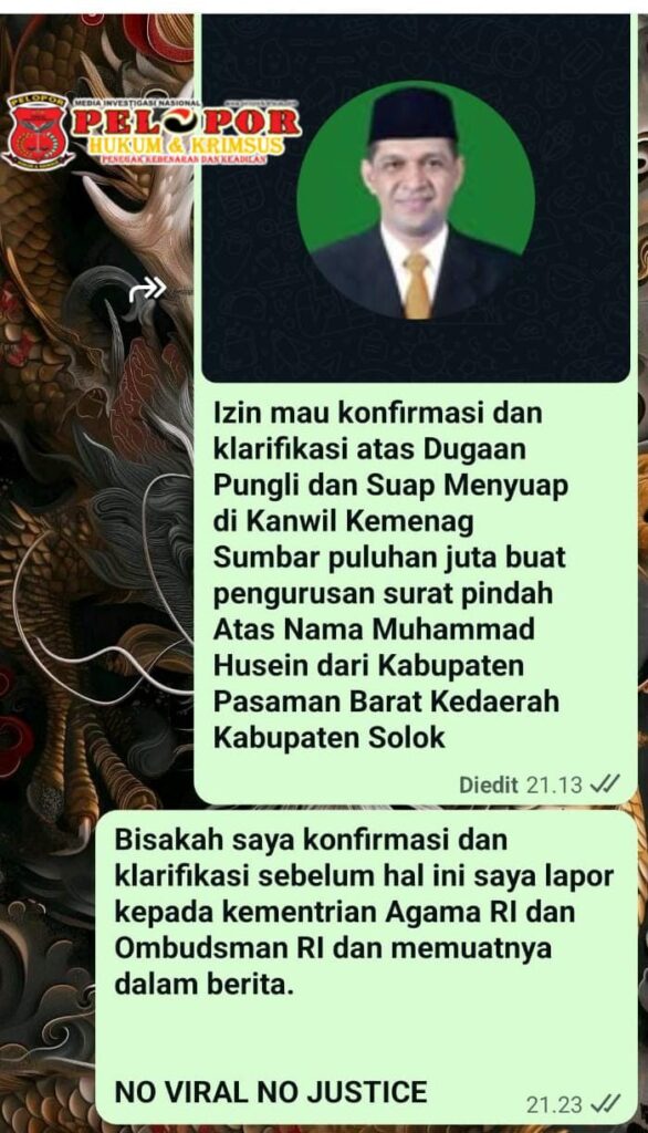 Sesuai kode etik jurnalis awak media menghubungi Kakanwil Kemenag Sumbar dan Kanmenag Pasbar untuk konfirmasi dan klarifikasi. Hingga berita ini terbit kedua pejabat Kemenag ini diam seribu bahasa seperti ketahuan media massa kebobrokan instansi yang mereka pimpin.