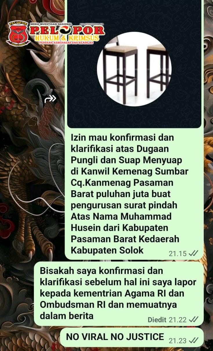 “Buat ngurus pindah ini saja bang habis udah terjual kebun saya,sebab di kankemenag pasaman barat urus pindah pakai uang,sampai ke Kakanwil Kemenag H.Mustafa juga butuh dana, besok saya ke Payakumbuh buat hantar berkas sekalian amplopnya.” Ujar Ahmad Osen melalui pembicaraan dikontak whatsapp 0813-7242-0606.