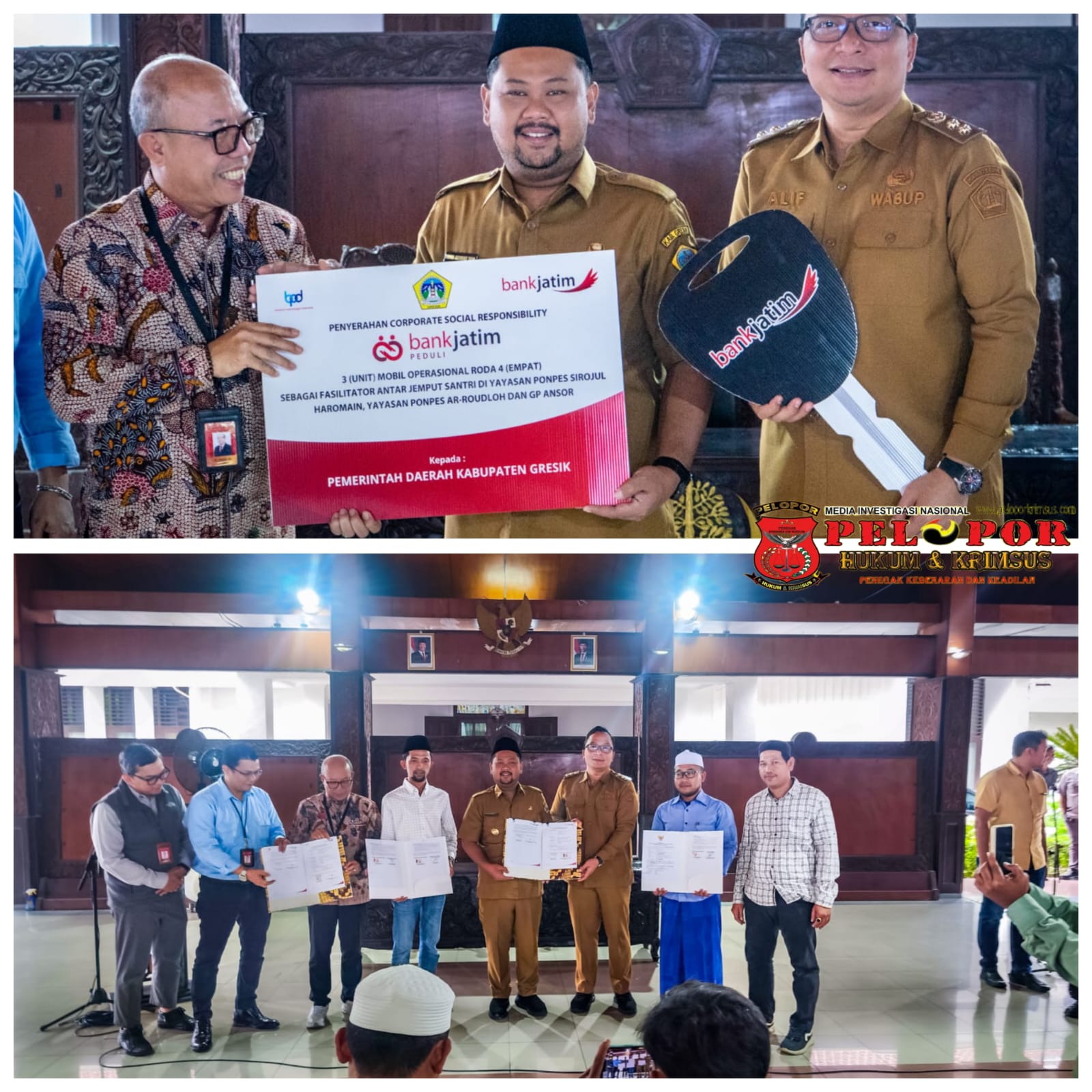 Pemerintah Kabupaten (Pemkab) Gresik menerima tiga unit mobil operasional sebagai bagian dari program Corporate Social Responsibility (CSR) Bank Jatim. Tiga unit kendaraan tersebut masing-masing diserahkan kepada Pondok Pesantren Sirojul Haromain, Pondok Pesantren Ar-Roudloh, serta GP Ansor Bawean.