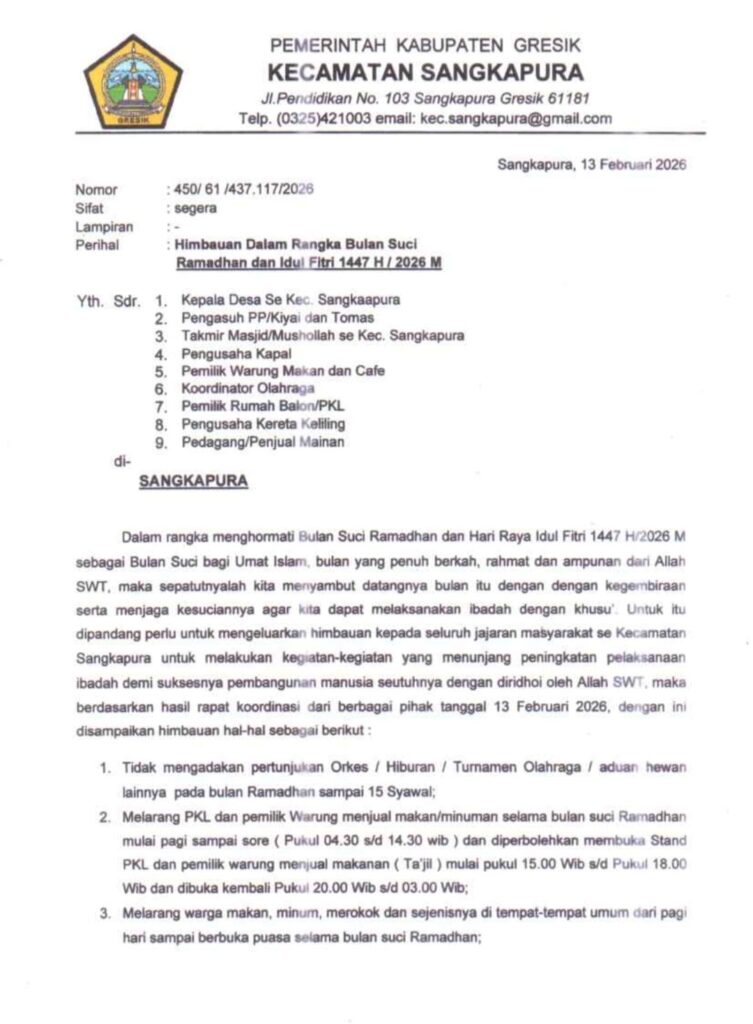 Gresik,peloporkrimsus.com – Menyambut datangnya Puasa Ramadan 1447 H – 2026 M, yang jatuh pada hari Kamis (18/2/2026), Camat Sangkapura Umar Junid menyampaikan himbauan kepada masyarakat, guna terciptanya Bulan Suci Ramadan yang damai dan penuh berkah. Jum’at (13/2/2026).