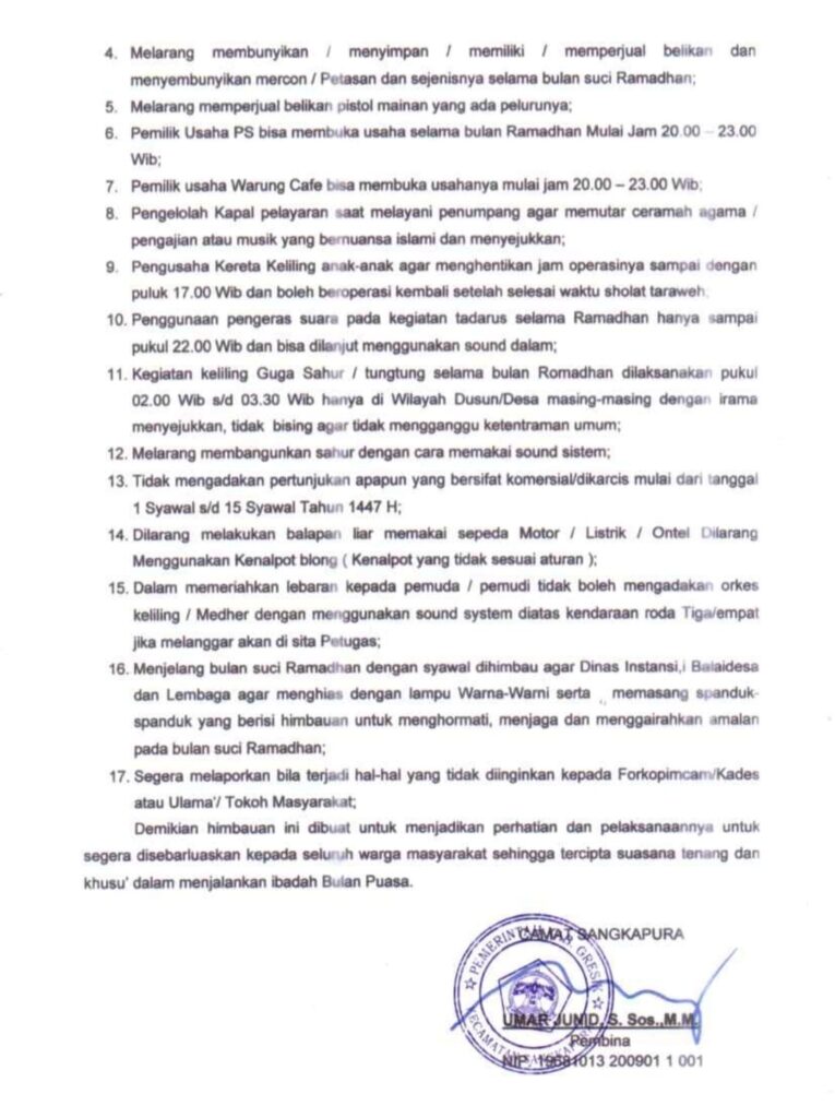 Poin penting dalam surat edaran dimaksud menyampaikan sejumlah imbauan kepada masyarakat guna menjaga dan menciptakan suasana Ramadan yang aman, damai dan penuh kekhusyukan.