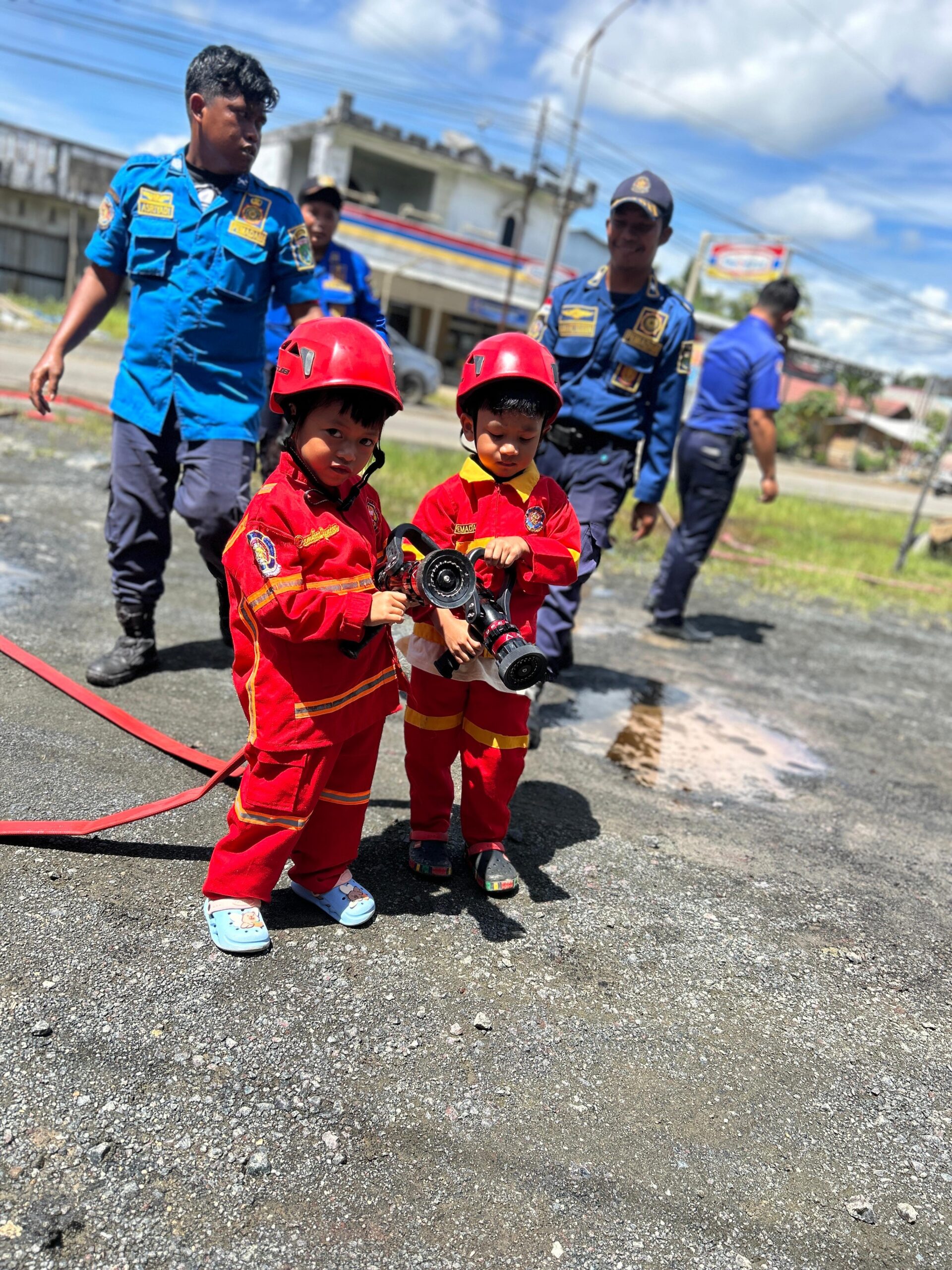 Sebagai penutup kegiatan, anak-anak diajak berkeliling menggunakan mobil pemadam kebakaran. Sorak gembira makin pecah ketika petugas menghidupkan semprotan air hingga menciptakan “hujan buatan” yang membuat suasana semakin menyenangkan.