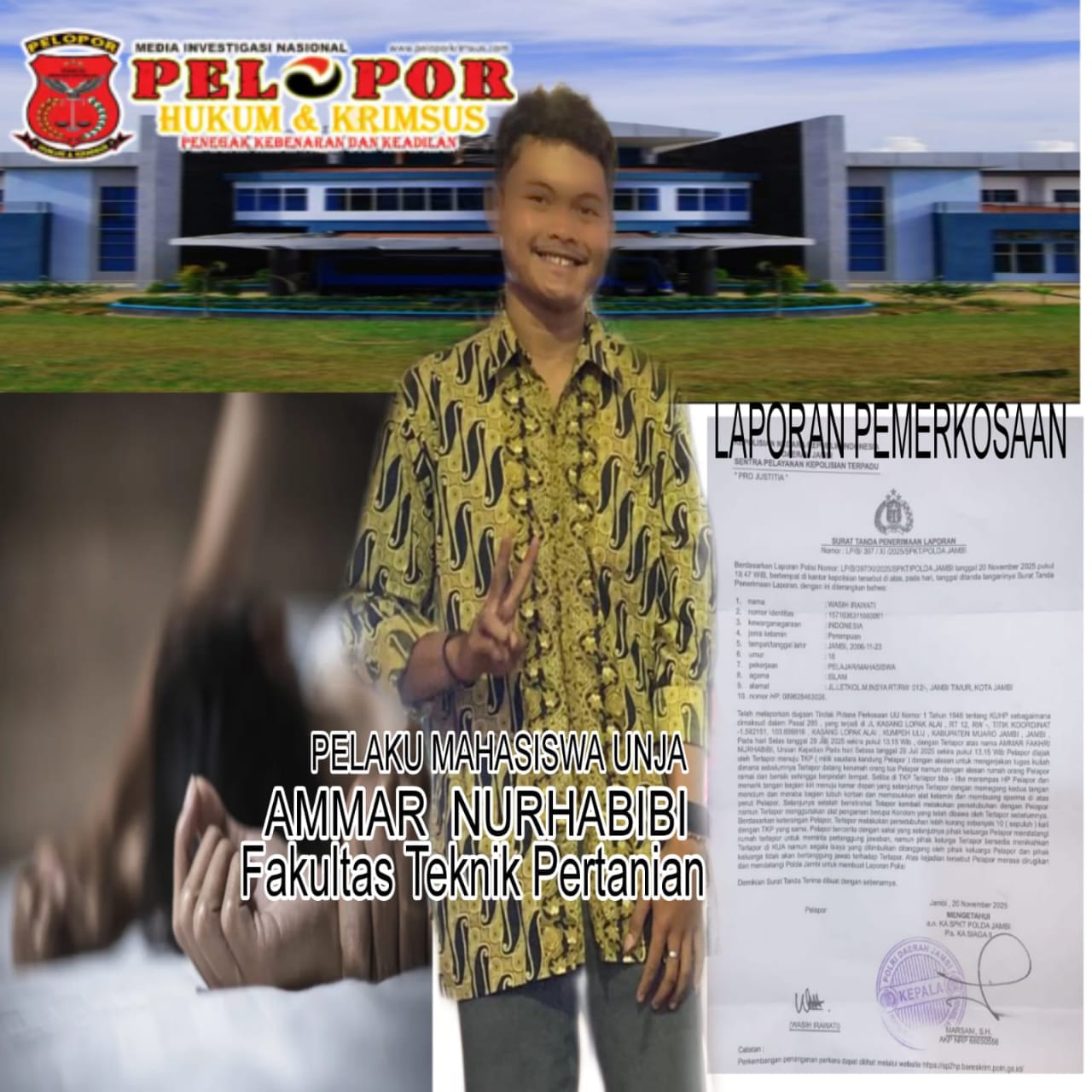 Jambi, peloporkrimsus.com – Jambi baru saja dihebohkan oleh pemerkosa dosen dan sekarang bakalan menambah daftar pemerkosa yang didugakan pada pelaku mahasiswa Universitas Jambi (UNJA_red) dalam surat laporan kepolisian bernomor:LP/B/397/XI/2025/POLDA JAMBI.
