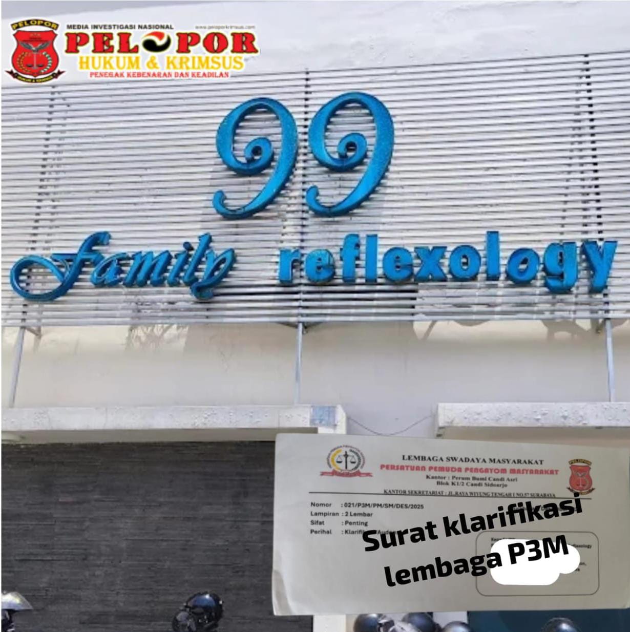 Ia menambahkan”Dugaan kuat tempat usaha 99 Reflexsology yang ada di Jl. Raya Darmo Permai Selatan No.21, Pradahkalikendal, Kec. Dukuhpakis, Surabaya,menyalahi Undang-Undang Nomor 17 Tahun 2023 tentang Kesehatan,seperti Peraturan Pemerintah Nomor 28 Tahun 2024,Pasal pidana yang menyalahi undang-undang kesehatan antara lain Pasal 440 UU Kesehatan (kelalaian medis mengakibatkan luka berat atau kematian) dengan ancaman pidananya bervariasi, mulai dari denda hingga penjara puluhan tahun, tergantung jenis pelanggarannya,
