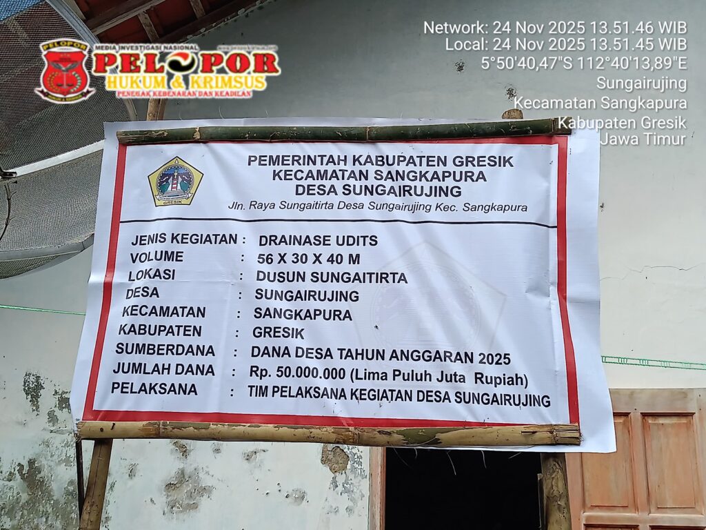 Menurut keterangan dari salah satu warga setempat yang enggan identitasnya disebutkan, bahwa pekerjaan drainase itu mestinya sudah lama selesai. Namun karena semua pekerjaan dikendalikan oleh Kepala Desa Sungairujing Zainal Abidin, makanya pekerjaan baru dimulai setelah tercium oleh LSM dan Awak Media. Pekerjaan tidak sesuai dengan papan informasi yang mengatakan kegiatan drainase uditch, sedangkan fakta dinlapangan hanya tambal “Sulap” selokan, Senin (24/11/2025).