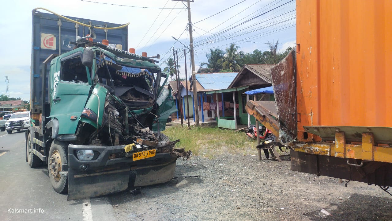 Kecelakaan terjadi saat sebuah kontainer hijau dengan nomor polisi DA 8746 TAP melaju dari belakang dan menghantam kontainer oranye DA 8025 TAO. Benturan keras itu membuat kabin truk hijau ringsek berat—kaca depan terlempar, bagian depan kendaraan hancur, dan serpihan material berserakan di sepanjang badan jalan.