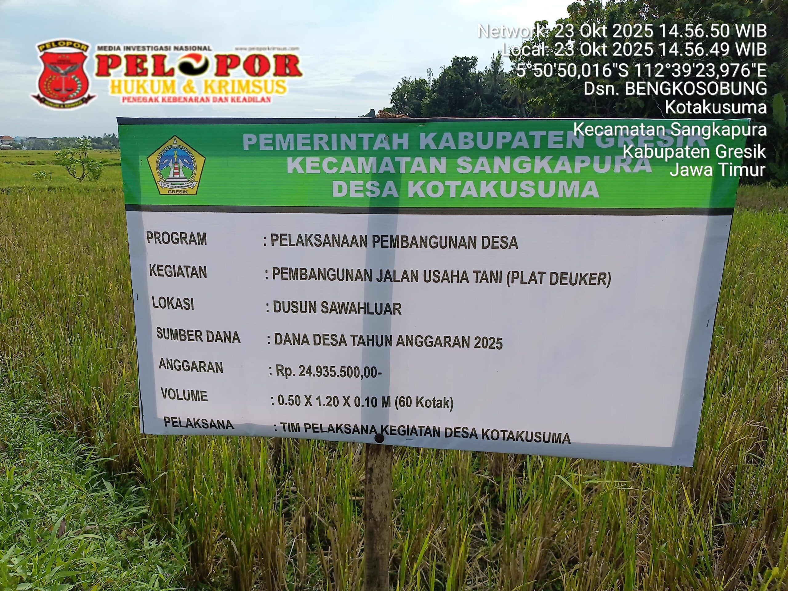 Atas temuan LSM GMBI KSM Sangkapura, awak media melalui telepon selulernya menghubungi salah satu perangkat desa Kotakusuma, Danang selaku Kaur Perencanaan sekaligus TPK dalam pekerjaan tersebut, menuturkan bahwa pekerjaan tutup drainase jalan usaha tani di dusun Sawahluar dianggarkan dari Dana Desa Tahun 2025 sebesar Rp 24.935.500,00- dengan volume 0.50×1.20×0.10 meter sebanyak 60 kotak.