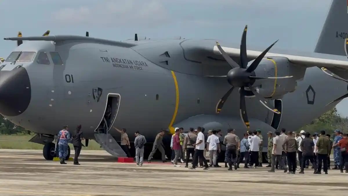 Menhan RI bersama rombongan tiba di Bandar Udara Bersujud sekitar pukul 11.00 WITA menggunakan pesawat Airbus A400M/MRTT Alpha 4001, salah satu pesawat angkut militer modern berkapasitas besar yang dimiliki Indonesia.