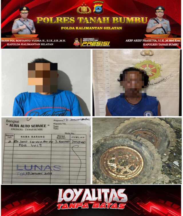 Tanah Bumbu, peloporkrimsus.com 17 Juni 2025 – Polsek Angsana berhasil menangkap dua orang diduga pelaku pencurian dengan pemberatan yang terjadi pada Selasa dini hari. Kasus ini melibatkan pencurian dua buah ban jenis Bridgestone beserta velg milik seorang wiraswasta, Achmad Sailillah, yang terekam jelas dalam rekaman CCTV.