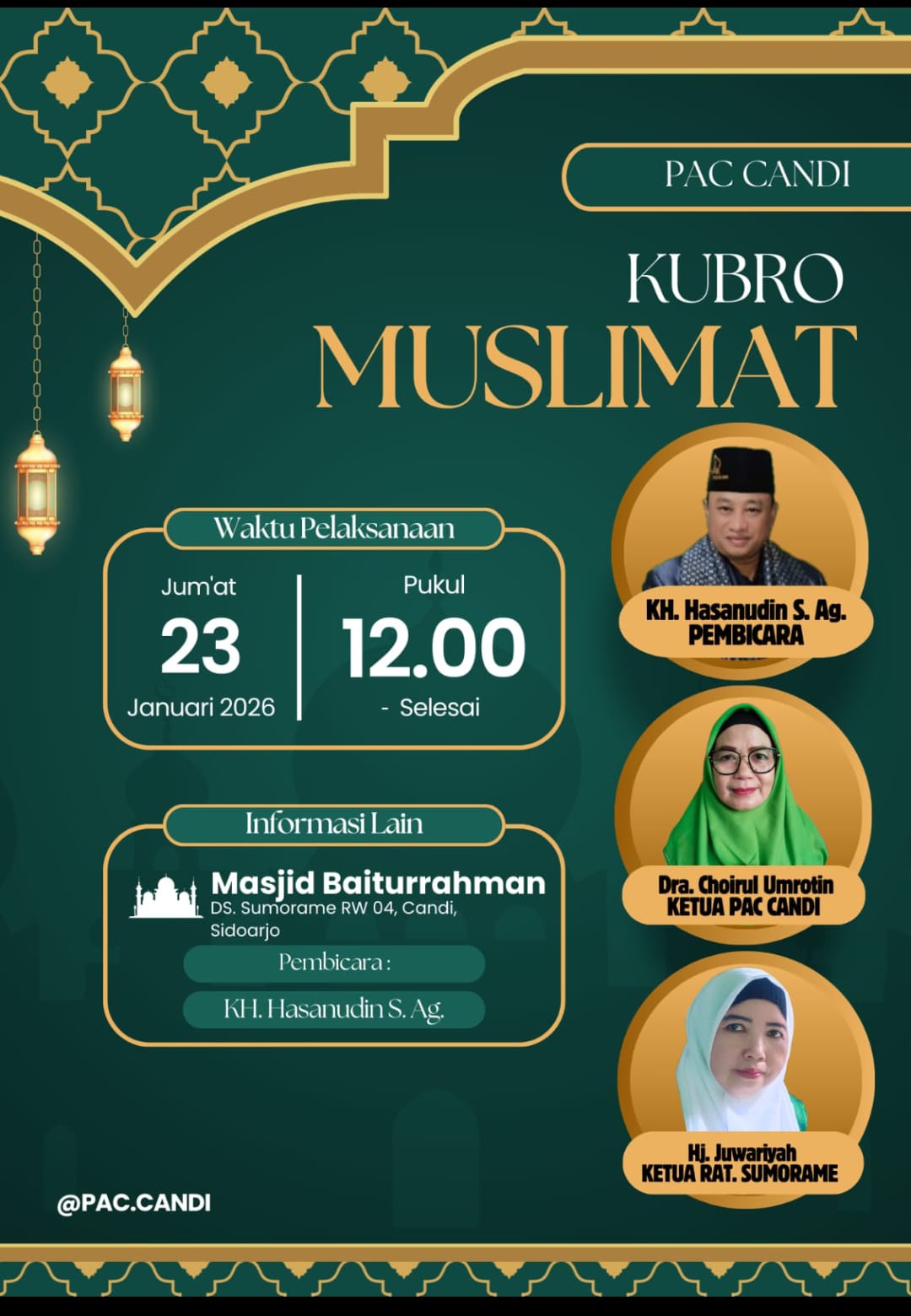 Sumorame,peloporkrimsus.com – Puluhan jemaah Muslimat Nahdlatul Ulama (NU) dari berbagai penjuru Kecamatan Candi memadati Masjid Baiturrohman di Desa Sumorame pada jumat (23/1/2026). Mereka menghadiri Pengajian Kubro yang diselenggarakan oleh Pimpinan Anak Cabang (PAC) Muslimat NU Kecamatan Candi di desa Sumorame.