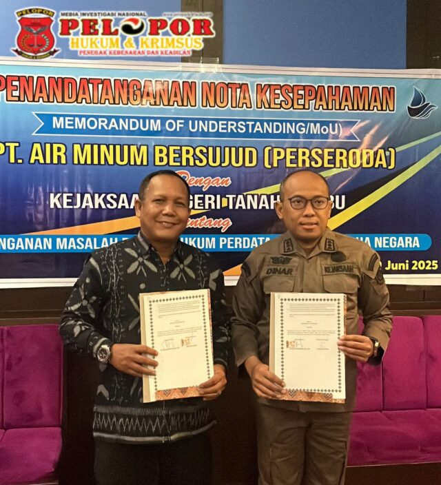 BATULICIN, peloporkrimsus.com – Pada tanggal 19 Juni 2025, PT. Air Minum Bersujud dan Kejaksaan Negeri Kabupaten Tanah Bumbu menandatangani nota kesepahaman (MoU) yang bertujuan untuk memperkuat kerjasama di bidang perdata dan tata usaha negara. Penandatanganan ini menjadi langkah strategis dalam upaya meningkatkan kepatuhan hukum serta meminimalisir potensi konflik antara perusahaan dan pelanggan.