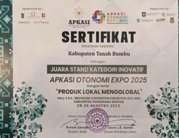 BATULICIN, peloporkrimsus.com – Kabupaten Tanah Bumbu mencatatkan prestasi gemilang dengan meraih penghargaan sebagai Stand Kategori Inovatif dalam gelaran Apkasi Otonomi Expo (AOE) 2025 yang berlangsung dari 28 hingga 30 Agustus 2025 di Indonesia Convention Exhibition (ICE) BSD, Tangerang. Acara ini mengusung tema “Produk Lokal Mengglobal,” yang menekankan pentingnya mempromosikan produk-produk unggulan daerah ke panggung internasional.