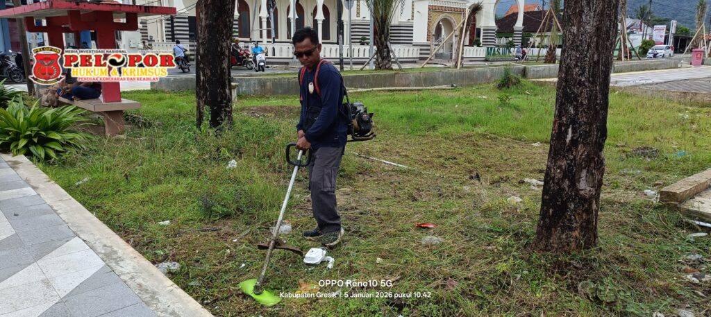 Gresik,peloporkrimsus.com – Alun-Alun Sangkapura yang merupakan wajah pulau Bawean semestinya terawat dan terjaga kebersihannya, namun fakta di lapangan sungguh memprihatinkan. Pasalnya, Alun-Alun Sangkapura sudah dilaksanakan Revitalisasi yang didanai oleh APBD Kabupaten Gresik tahun 2025, terlihat tidak terawat hingga di bagian pinggir pedestarian tumbuh subur rumput liar. Melihat kondisi tersebut, Kepala Kantor UPT PJJ dan SDA Wilayah Bawean, Mohammad Rizki langsung menerjunkan Tim Unit Reaksi Cepat (URC) Bina Marga untuk ikut ambil andil membersihkan Alun-Alun Sangkapura yang akan dijadikan sebagai Taman Akustik.