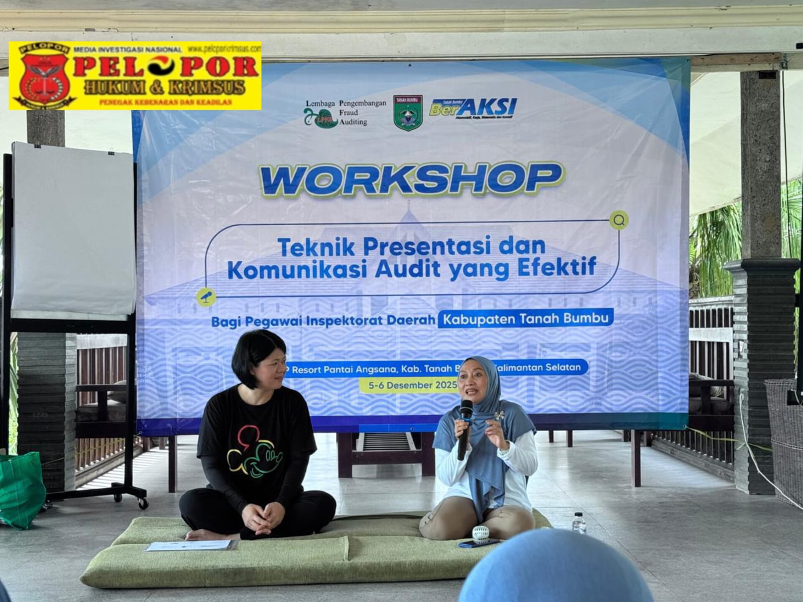 TANAH BUMBU,Peloporkrimsus.com – Inspektorat Kabupaten Tanah Bumbu menggelar Workshop Teknik Presentasi dan Publikasi Audit yang Efektif di MP Resort Pantai Angsana, Sabtu (6/12/2025). Kegiatan ini menghadirkan pemateri profesional Listiani Aslim, SE, MBA, CBA, CMHA, QIA, QHIA dari Lembaga Pengembangan Fraud Auditing (LPFA), yang dikenal sebagai professional trainer, konsultan, behavior analyst, dan grafolog.