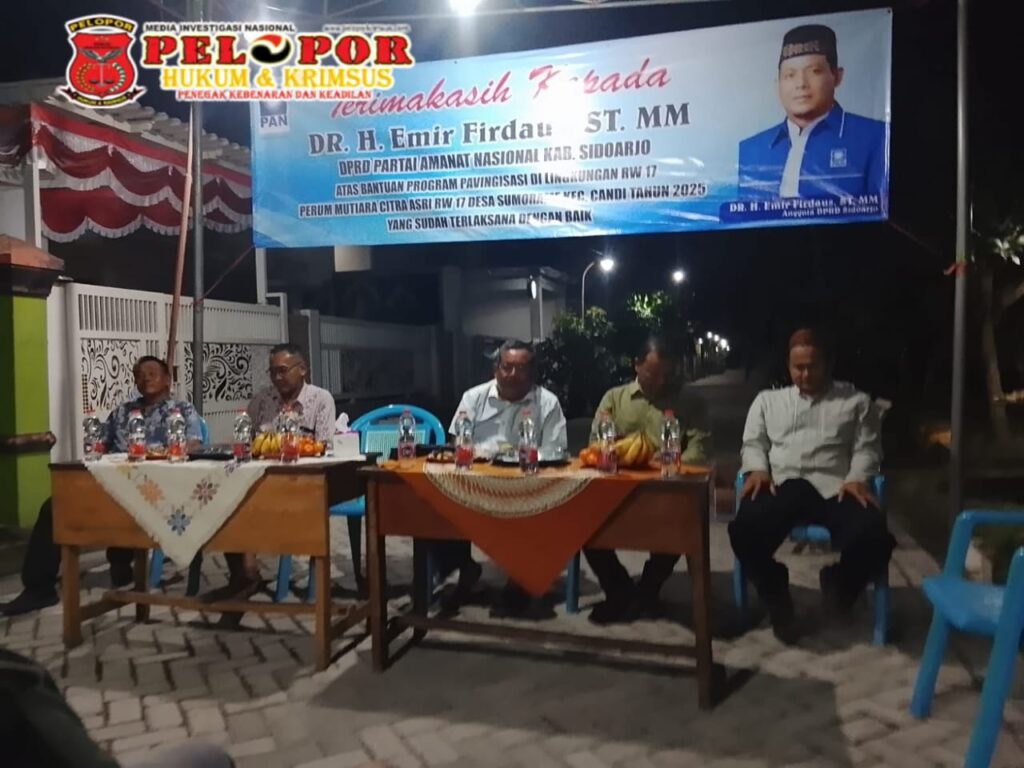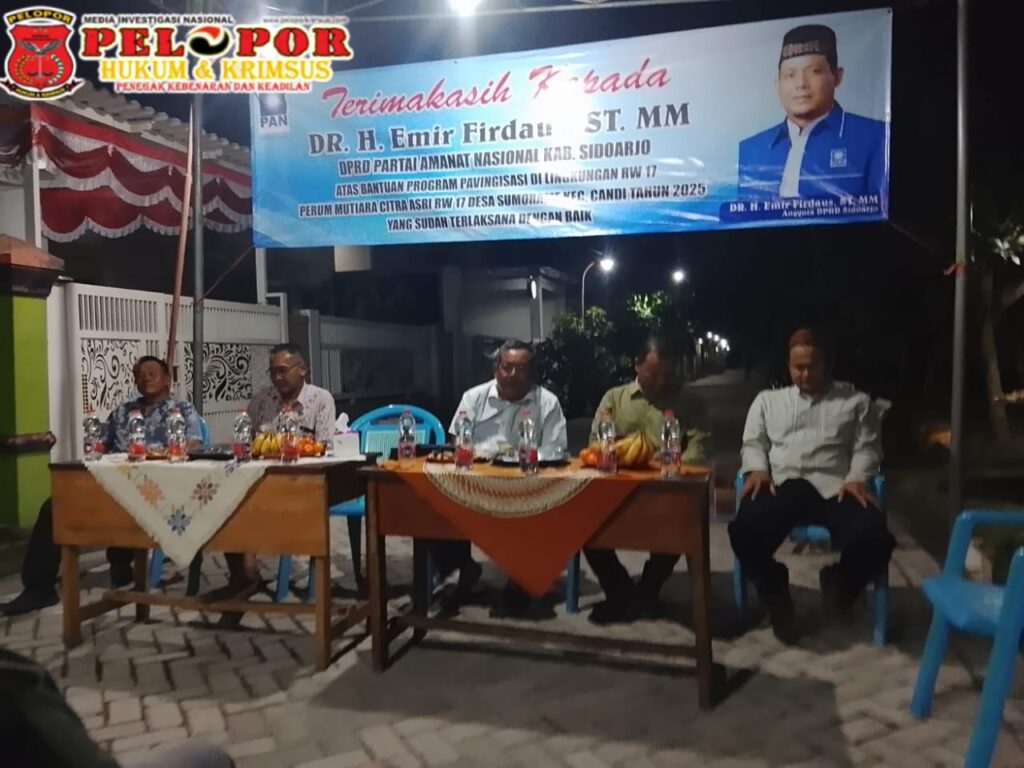 Sidoarjo,Peloporkrimsus.com – Warga RW 04 dan RW 17, Desa Sumorame, Kecamatan Candi Kabupaten Sidoarjo, mengucapkan terima kasih kepada anggota DPRD kabupaten Sidoarjo Dr. Emir firdaus,ST.M.M yang juga ketua DPD PAN Sidoarjo atas terealisasinya pembangunan jalan paving block.
